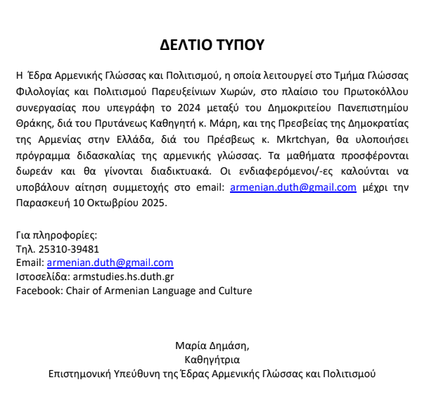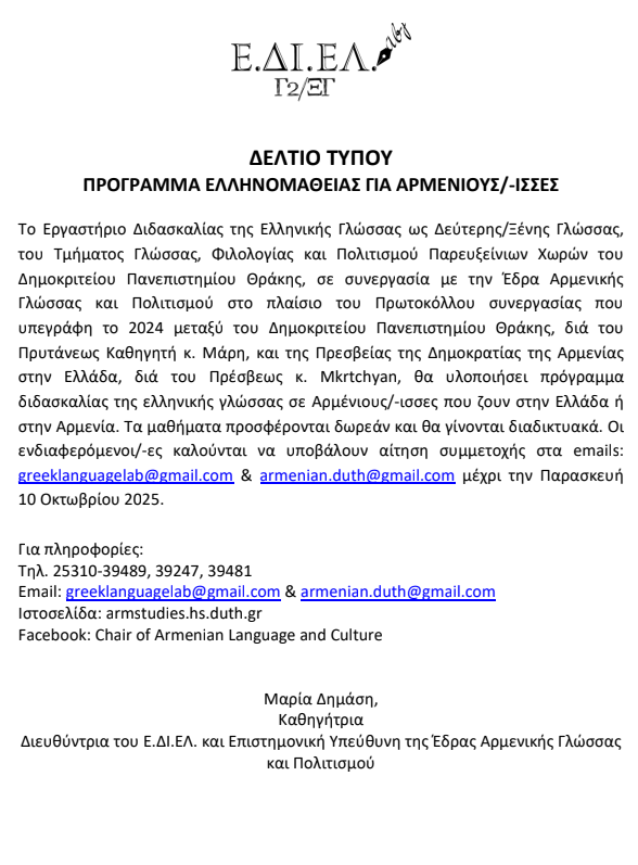 Το Εργαστήριο Διδασκαλίας της Ελληνικής Γλώσσας ως Δεύτερης/Ξένης Γλώσσας, του Τμήματος Γλώσσας, Φιλολογίας και Πολιτισμού Παρευξείνιων Χωρών του Δημοκριτείου Πανεπιστημίου Θράκης, σε συνεργασία με την Έδρα Αρμενικής Γλώσσας και Πολιτισμού στο πλαίσιο του Πρωτοκόλλου συνεργασίας που υπεγράφη το 2024 μεταξύ του Δημοκριτείου Πανεπιστημίου Θράκης, διά του Πρυτάνεως Καθηγητή κ. Μάρη, και της Πρεσβείας της Δημοκρατίας της Αρμενίας στην Ελλάδα, διά του Πρέσβεως κ. Mkrtchyan, θα υλοποιήσει πρόγραμμα διδασκαλίας της ελληνικής γλώσσας σε Αρμένιους/-ισσες που ζουν στην Ελλάδα ή στην Αρμενία. Τα μαθήματα προσφέρονται δωρεάν και θα γίνονται διαδικτυακά. Οι ενδιαφερόμενοι/-ες καλούνται να υποβάλουν αίτηση συμμετοχής στα emails: greeklanguagelab@gmail.com & armenian.duth@gmail.com μέχρι την Παρασκευή 10 Οκτωβρίου 2025.